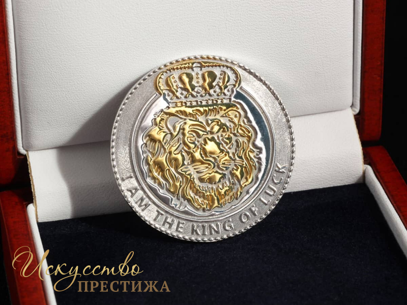 Уникальная монета с индивидуальным дизайном, которую заказали на подарок другу. Это один из безпроиграшних вариантов подарка для человека, у которого все есть. Более того, такая монета будет существовать только в одном экземпляре, ведь ее создатель - именно вы, ваши оригинальные идеи. Задумка дизайна довольно необычная: заказчики решили изобразить на лицевой стороне монеты прототип именинника - льва. На серебряном металле очертания льва выделяются благодаря золотому покрытию, а снизу нанесен персональный надпись, символизирующий удачу получателя.