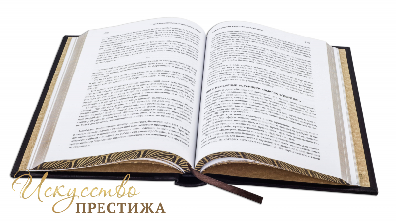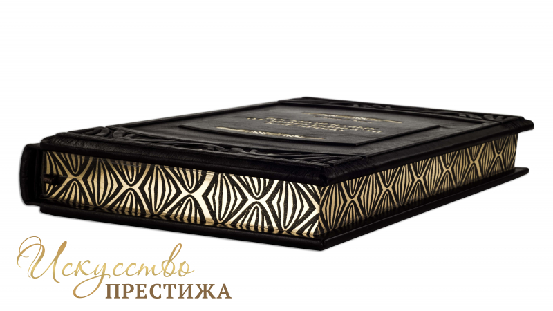 Французский переплет ручной работы, изготовленный из натуральной итальянской кожи теленка «terracotta». Обложка книг оформлена объемными узорами ручного тиснения, рельефным тиснением золотой фольгой Luxor в 24 карата, холитенами (цвет «Gold») количеством 8 шт. Обрез книги полирован и окрашен вручную (цвет «Bronze»).