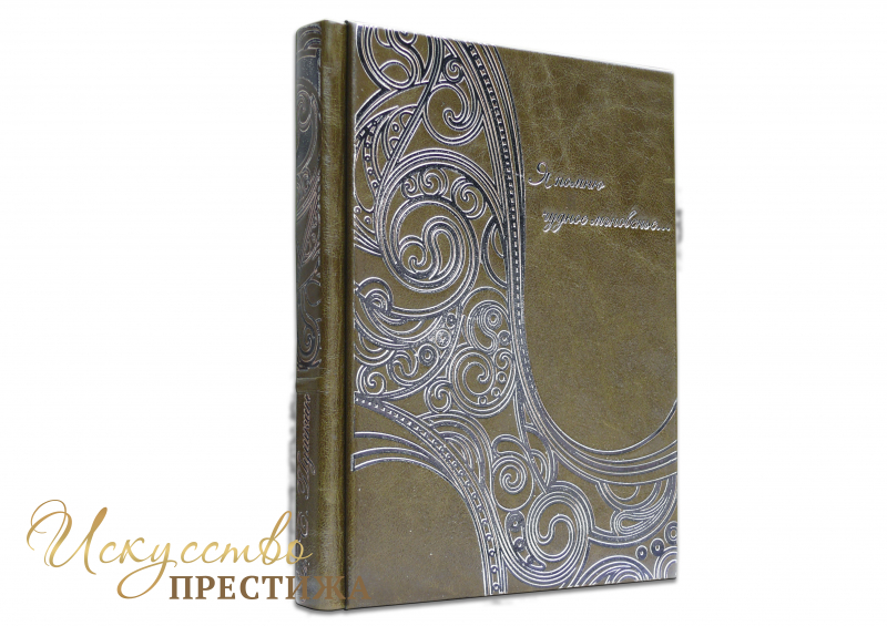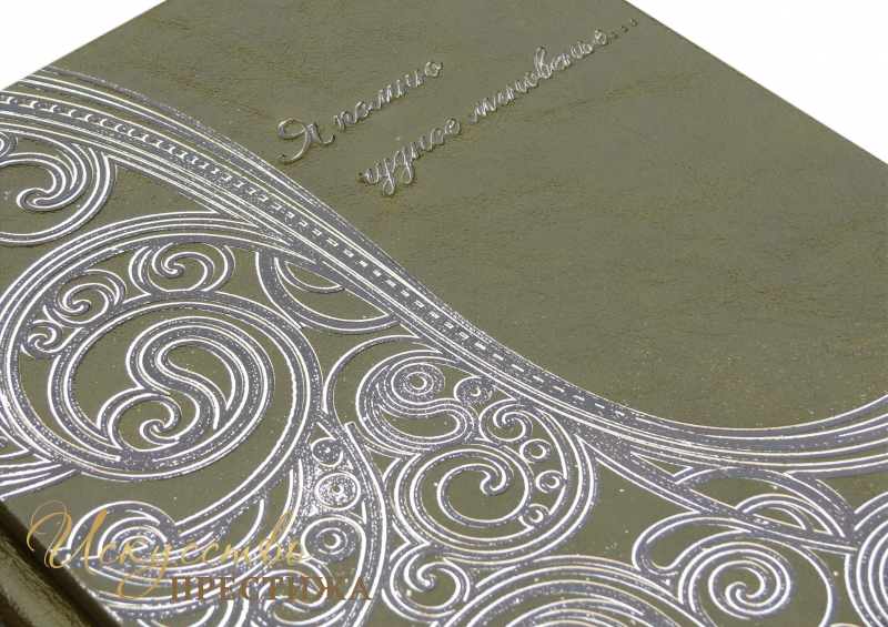 Французский составной переплет ручной работы выполнен из натуральной кожи «Alga marina» производства итальянской кожевенной фабрики «Carisma». Обложка книги оформлена авторской техникой тиснения - хамелеон (переливается тремя цветами). Обрез блока вручную полирован и позолочен сусальным золотом.