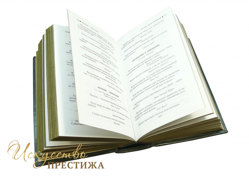 Французский составной переплет ручной работы, выполненный из натуральной кожи теленка «» производства итальянской кожевенной фабрики «Motta Alfredo». Обложка книги оформлена объемными узорами ручного тиснения, рельефным золотым тиснением с использованием золотой фольги «Luxot 240», латунными холитенами (цвет «Gold») количеством 4 шт., обрез книги полирован и окрашен вручную, цвет «Bronze».