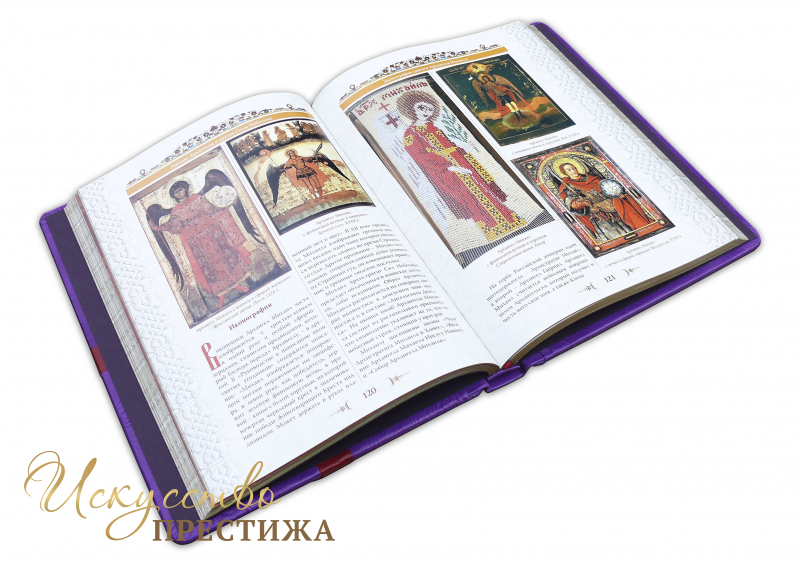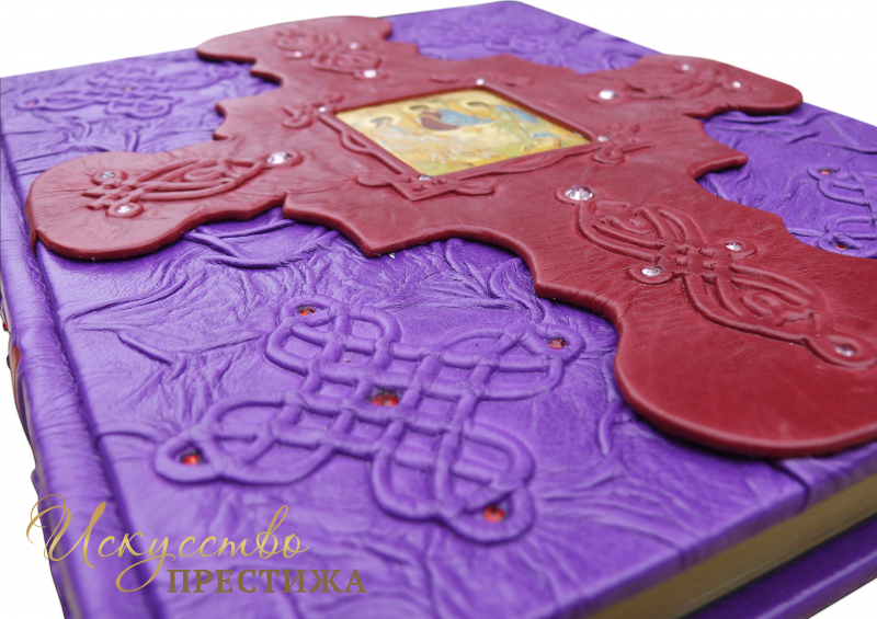 Французский составной переплет ручной работы, выполнен из комбинации натуральных кож (Кожа телячья «Purple metallic», Кожа телячья «Rossa», производства итальянской кожевенной фабрики «Carisma». Обложка книги оформлена объемными узорами ручного тиснения, в обрамлении объемной помятости, с инкрустацией камнями циркон брильянтовой огранки, цвет «аметист» (3 мм. - 14 штук, 5 мм. – 4 штуки), цвет «гранат» (3 мм. - 24 штук, 5 мм. – 6 штук). По центру обложки размещена писанная икона «Господь» (написана в Афоне, Греция). Обрез книги полирован и окрашен вручную, цвет «Bronze».