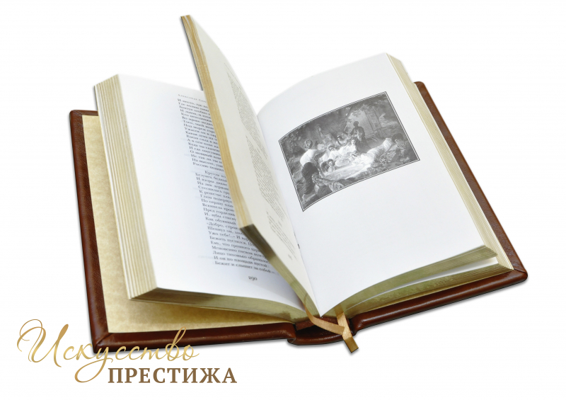 Французский составной переплет ручной работы выполнен из натуральной кожи теленка «Robbat Cognac» производства итальянской кожевенной фабрики «Claudio». Обложка книги оформлена объемными узорами ручного тиснения: глубоким блинтовым и рельефным золотым, c использованием фольги «Luxor 240». Обрез блока вручную полирован и позолочен сусальным золотом.