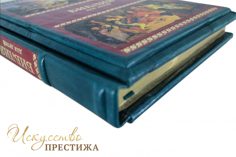 Французский составной переплет ручной работы изготовлен из комбинации кожи (кожа «Robbat Rossa» и кожа «Olum Blue») производства итальянской кожевенной фабрики «Carisma». Обложка книги двухуровневая, оформлена рельефным золотым тиснением, с использованием золотой фольги «Luxor 240», и вставками из холста с художественной печатью. Обрез книги вручную полирован и позолочен сусальным