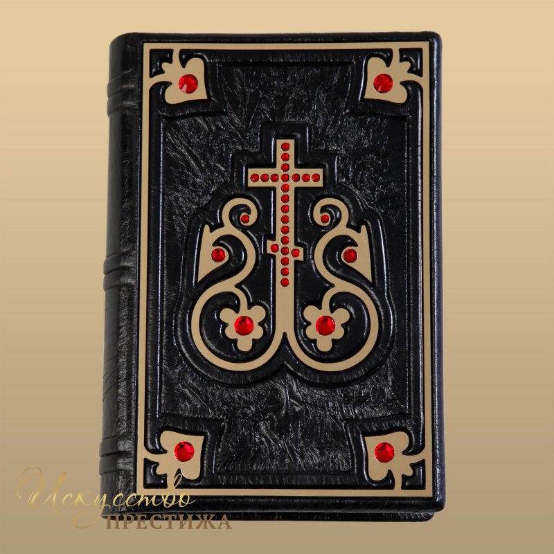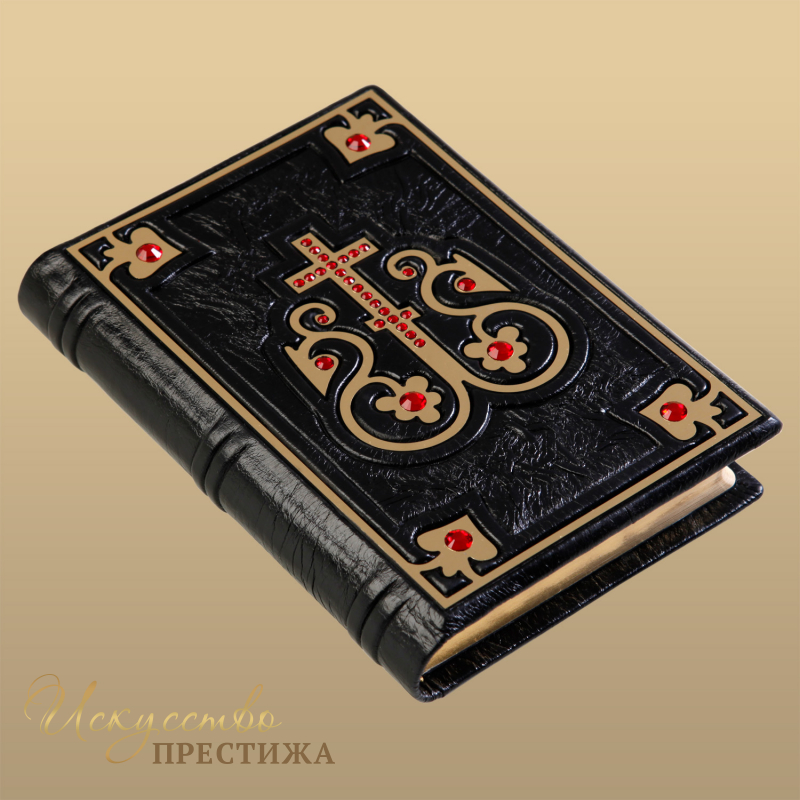 О переплете: переплет французскийцельноКожаный ручной работы. Круглёные корешки книг украшают высокие бинты. Кожа цвета эбенового дерева (Италия). В середине крест – гравировка, цвет - "золото",инкрустирован кристаллами Swarovski. Каптал шелковый, ручного плетения. Форзацсоставной. Обрез полированный, окрашенный вручную, цвет золото. Техники: гравировка, высокий рельеф и тиснение по коже.