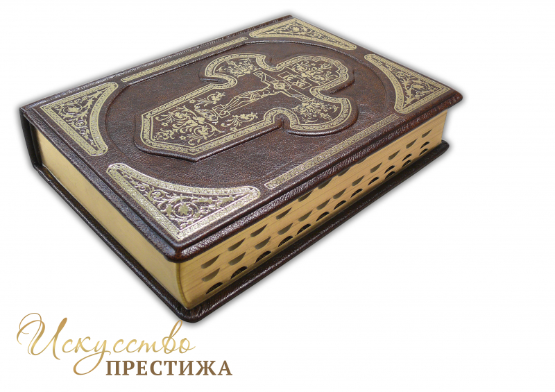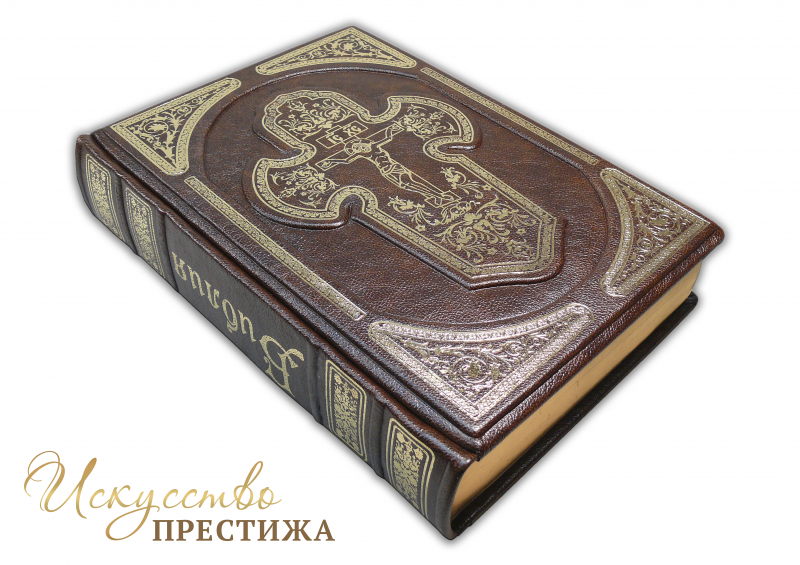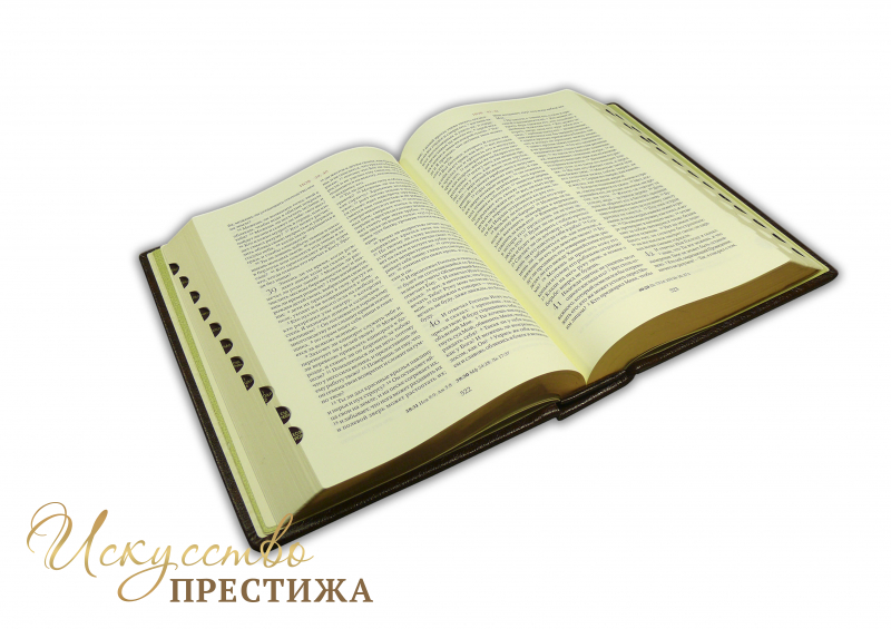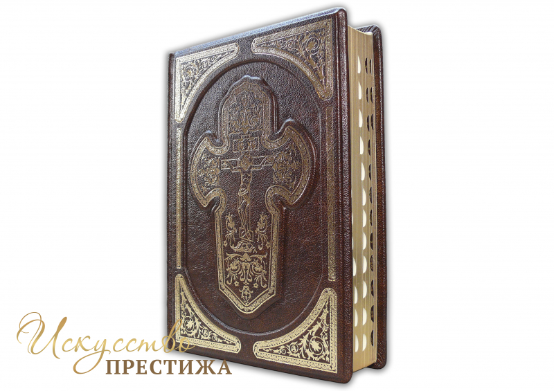 Одно из лучших изданий для чтения. Огромный шрифт, современная редакция синодального перевода, рисовая тонированная бумага для минимизации усталости глаз, в комплекте идут цветные карты святых мест, листы для памятных дат. Обрез полированный, золоченый, с поисковыми индексами. Французский составной переплет ручной работы, выполненный из натуральной кожи «Marma Brown» производства итальянской кожевенной фабрики Claudio. Обложка книги двухуровневая, оформлена рельефным золотым тиснением.