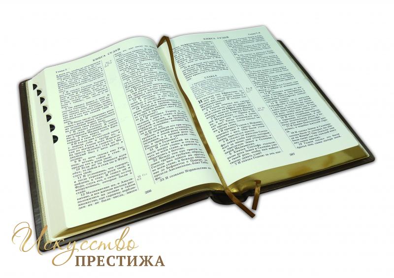 Одно из лучших изданий для изучения Священного Писания. Огромный шрифт, современная редакция синодального перевода, рисовая тонированная бумага для минимизации усталости глаз, в комплекте идут цветные карты святых мест, листы для памятных дат. Обрез полированный, золоченый, с поисковыми индексами. Французский составной переплет ручной работы, выполненный из натуральной кожи «Marrone Cioccolato» производства итальянской кожевенной фабрики Carisma. Обложка книги оформлена в авторской технике «рельефное тиснение по объемным узорам».