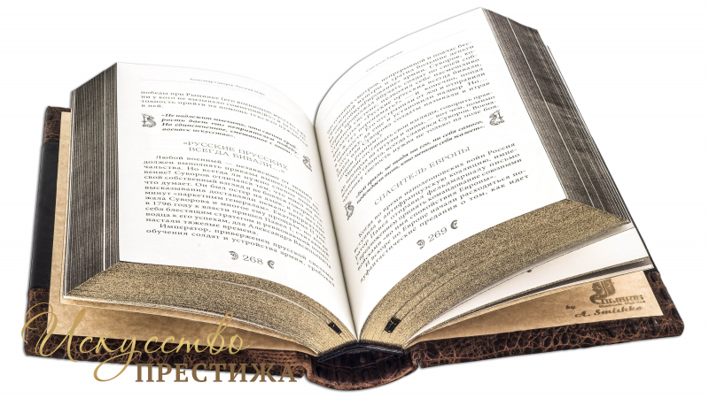 Составной переплет «Брадель», ручной работы, выполнен из комбинации натуральной кожи (кожа «Robbat Nero», кожа «Crocozombo» производства итальянской кожаной фабрики «Benericetti»). Обложка книги двухуровневая, оформлена рельефным золотым тиснением (использована фольга «Luxor 240»). Обрез выполнен в уникальной технологии художественной запечатки золотой основы.