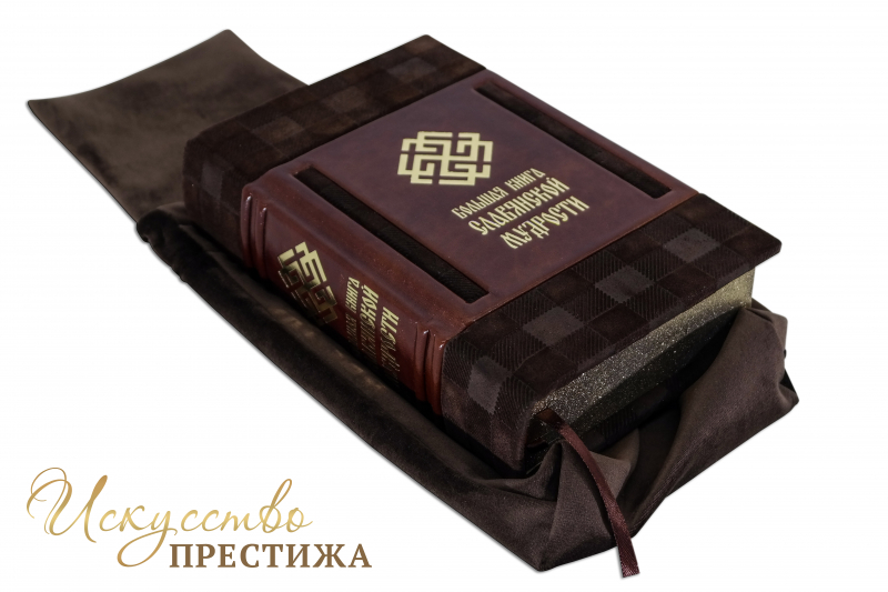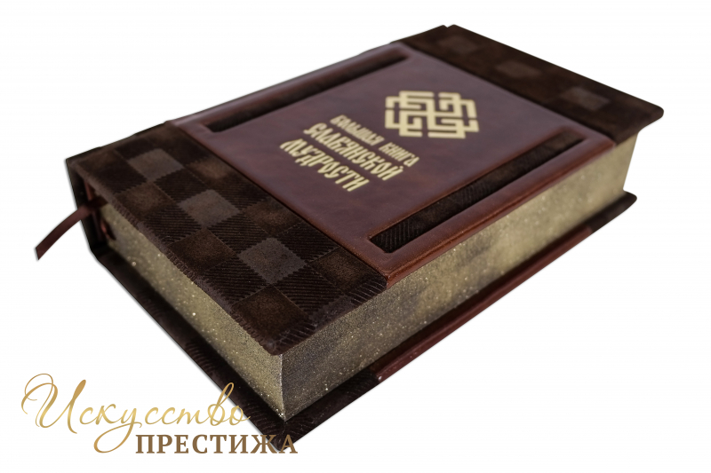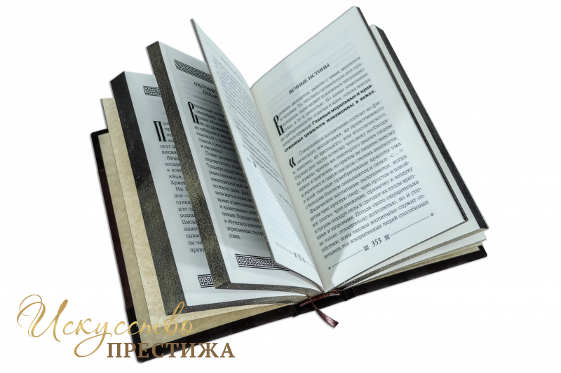 Французский составной переплет ручной работы выполнен из комбинации натуральной кожи (кожа «Robbat Cognac», кожа «Gabbia Camoscio» производства итальянской кожаной фабрики «Benericetti»). Обложка книги двухуровневая, оформлена рельефным золотым тиснением (использована фольга «Luxor 240»). Обрез книги оформлен в уникальной технике «Хамелеон» с использованием сусального золота.