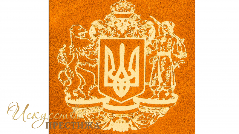 Французька складова палітурка ручної роботи виконана з натуральної шкіри «Robbat beige», виробництва італійської фабрики «Carisma». Обкладинка книги двохрівнева, оздоблена вставками з холста, багаторівневим тисненням: глибоким блінтовим і рельєфним золотим, з використанням фольги «Luxor 240». Обріз вручну поліровано і позолочено сусальним золотом.