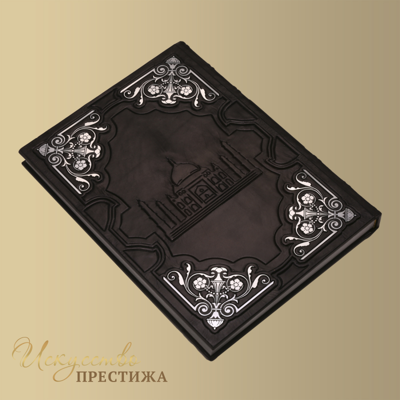 О переплете: Переплет французский цельнокожаный, ручной работы на трех шнурах. Кожа цвет "темно коричневый" (Италия). В центре художественная композиция, обрамление – гравировка цвет "серебро" и "золото". Инкрустация кристаллами Swarovski. Каптал шелковый, ручного плетения. Форзац составной. Обрез полированный, цвет "серебро".