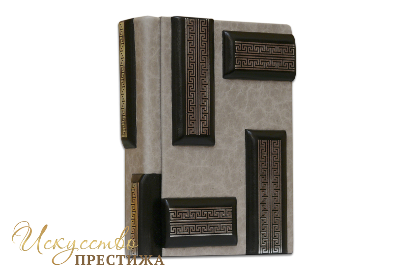 Французский составной переплет ручной работы изготовлен из комбинации натуральных кож (Кожа теленка «Robbat nero», Кожа теленка «Marmo chiaro» производства итальянской кожевенной фабрики «Benericetti»).Обложка книги оформлена объемными элементами ручного затягивания в кожу, рельефным серебряным тиснением, с использованием фольги «Luxor 240». Обрез блока вручную полирован и посеребрен сусальным серебром.