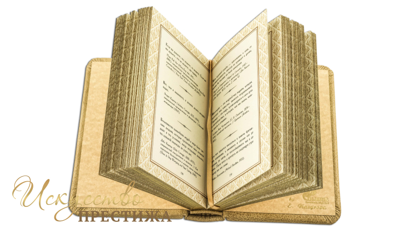 Подарочное издание удобного формата, гармонично оформленное цветной печатью. Французский составной переплет ручной работы, выполненный из натуральной кожи «Marma Parle» производства кожевенной итальянской фабрики «Claudio». Обложка книги оформлена многоуровневым тиснением – глубоким блинтовым и рельефным золотым, с использованием золотой фольги «Luxor 240». Обрез полирован и окрашен вручную, цвет «Bronze». Тираж 50 номерных экземпляров. Сертификат.