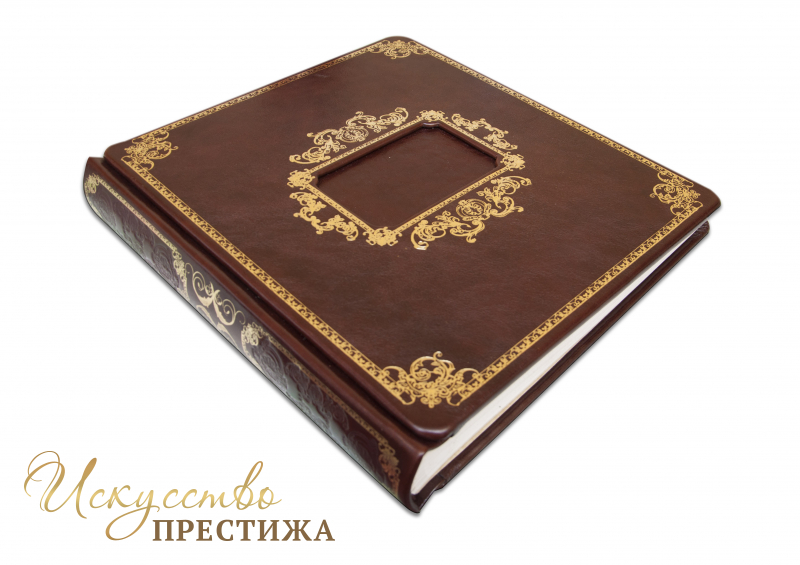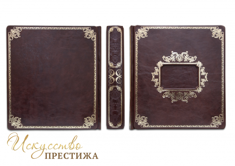 Французский составной переплет ручной работы выполнен из натуральной кожи «Prugna» производства итальянской кожевенной фабрики «Claudio». Обложка альбома двухуровневая, оформлена рельефным золотым тиснением, с использование фольги «Luxor 240» и глубоким блинтовым.