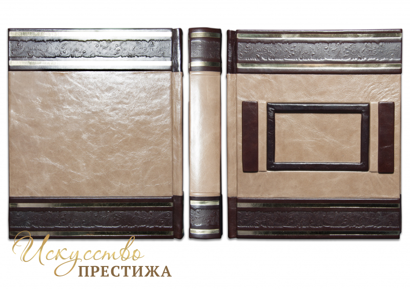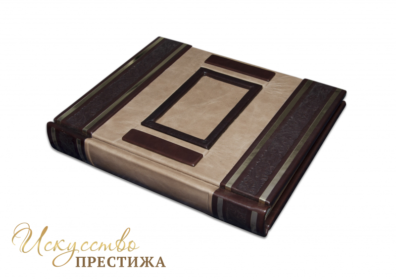 Французский составной переплет ручной работы выполнен из комбинации натуральных кож (Кожа «Robbat Wisky», Кожа «Robbat Parle» производства итальянской кожевенной фабрики «Claudio»). Обложка книги двухуровневая, оформлена рельефным золотым тиснением, с использование фольги «Luxor 240» и глубоким блинтовым.