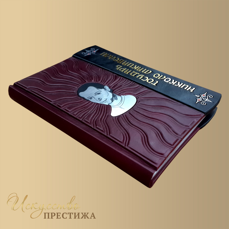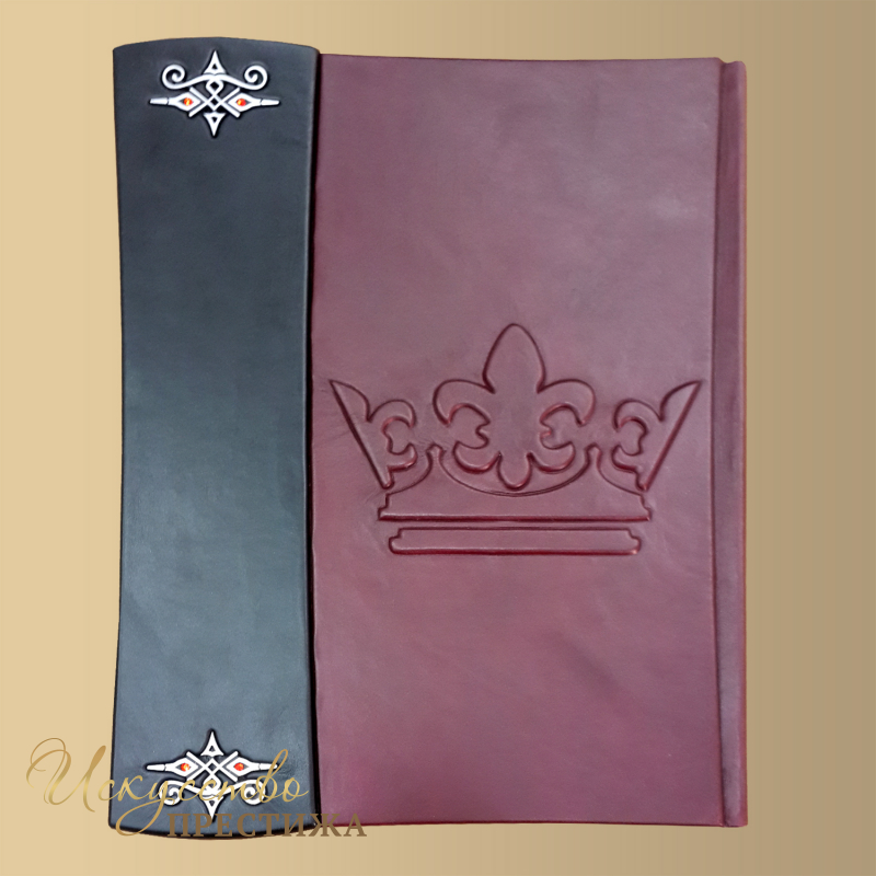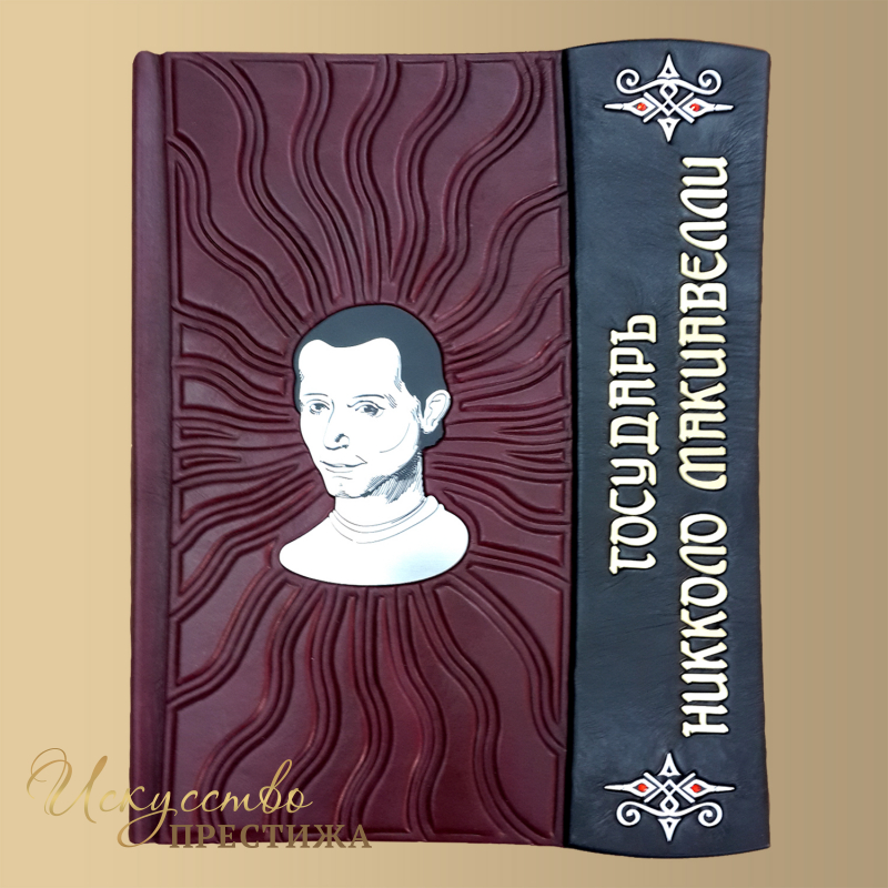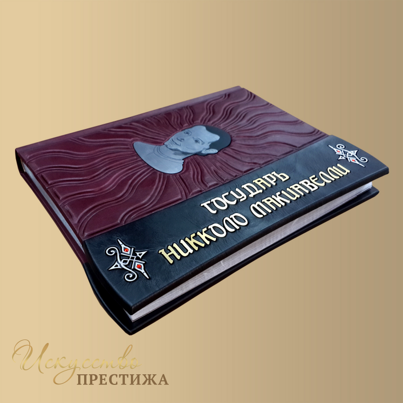 О переплете: переплет французский цельнокожаный, ручной работы. Кожа, цвет - "бордо" , комбинированная с кожей цвета "виск ". Все элементы на обложке - высокий рельеф и тиснение по коже выполнены вручную. В середине - гравированная композиция «портрет Макиавелли» , цвет - "золото". На корешке книги рельефные бинты. Форзац составной. Обрез полированный, цвет - "золото".