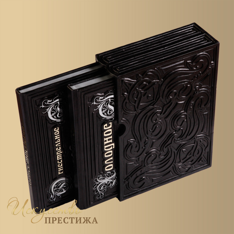 О переплете: переплет французский цельнокожаный, ручной работы. Кожа цвета эбенового дерева (Италия), а также вставка из кожи цвета "виски". Рельеф на коже и тиснение выполнены вручную. Круглёные корешки книг украшают высокие бинты. Обложка декорирована гравированной композицией, цвет - "золото" и " серебро". Каптал шелковый, ручного плетения. Форзац составной. Обрез полированный, цвет - "серебро".