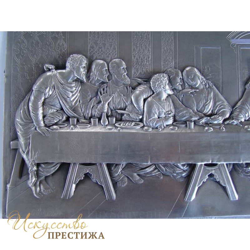 Икона Тайная вечеря выполнена методом гальванопластики с покрытием чистым Серебро 925-й пробым. На икону вручную нанесен патинирующий состав и защитный слой воска.