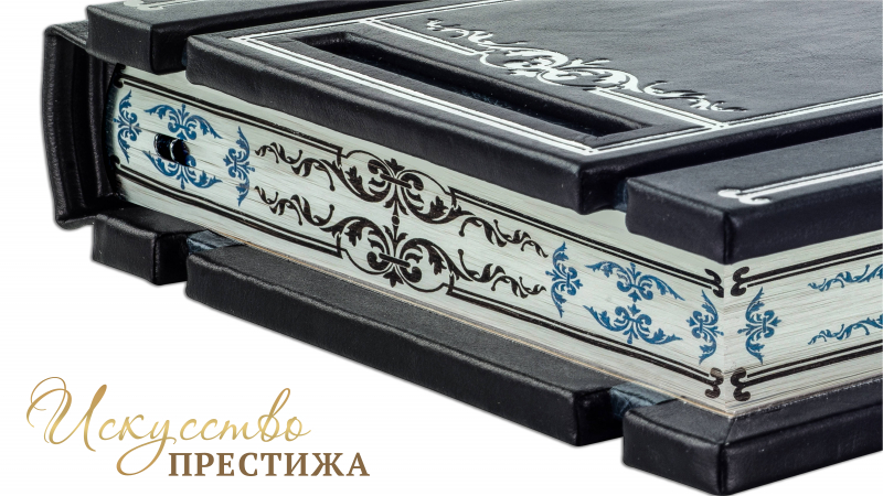 Французский составной переплет ручной работы выполнен из комбинации натуральной кожи (Кожа теленка «Nero Zegna», Кожа «Robbat Blue» производства итальянской кожевенной фабрики «Carisma»). Обложка книги уникальной двухуровневой архитектуры оформлена рельефным серебряным тиснением c использованием фольги «Luxor 240». Обрез книги вручную полирован и посеребрен сусальным серебром.