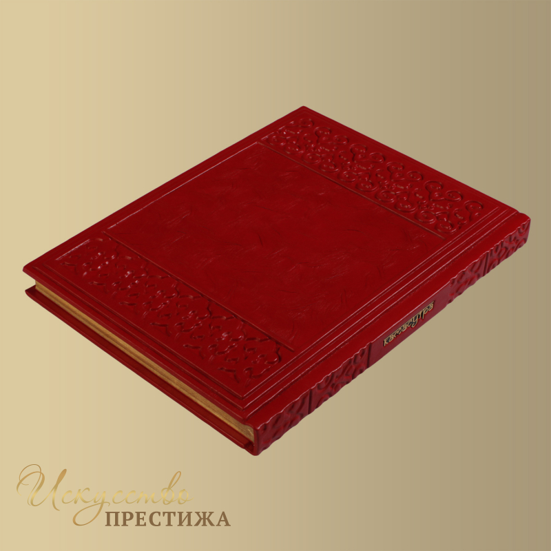 О переплете: Переплет французский цельноКожаный,ручной работы. Кожа цвет "рубин", декоративная вставки цвет "золото" (Италия). Рамка с орнаментом, название - гравировка цвет "золото " и "серебро". Обрез окрашен вручную цвет "золото".