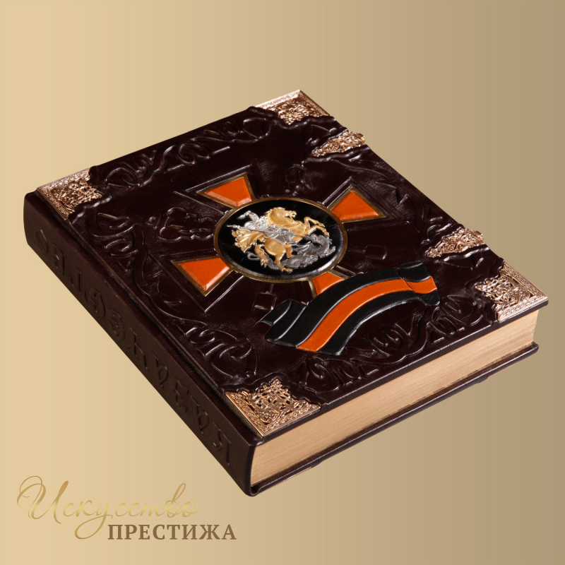 О переплете: переплет французскийцельноКожаный, ручной работы. Кожа коричневого цвета (Италия). Рельеф на коже и тиснение выполнены вручную. В центре художественная композиция - литье с элементами позолоты 24 каратным золотом "Георгий ПОбедоносец". Каптал Кожаный. Форзац составной. Обрез полированный, окрашенный вручную, цвет - "золото". На углах декоративные металлические накладки с красивым узором. Книга закрывается на металлические застежки.