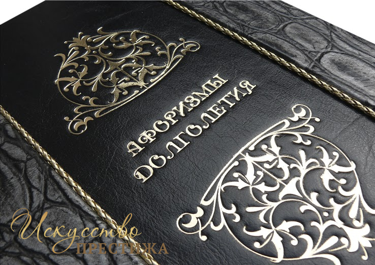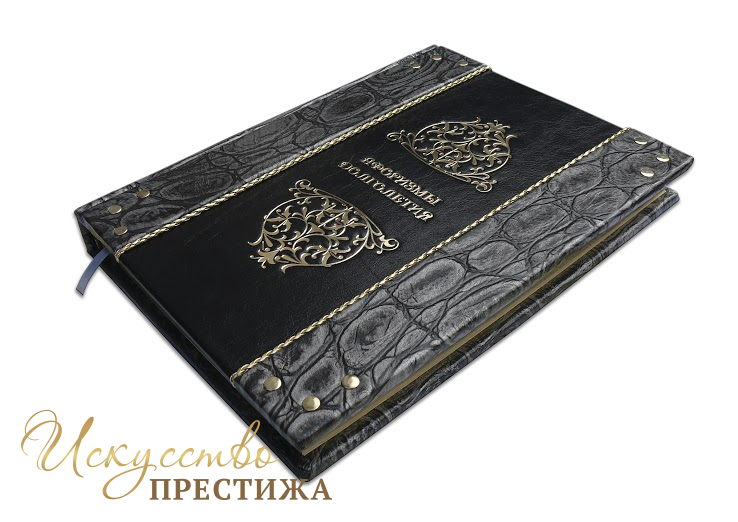 Французский составной переплет ручной работы выполнен из комбинации натуральных кож (кожа «Robbat nero», кожа «Argento dinosauro» производства итальянской кожевенной фабрики «Claudio»). Обложка книги двухуровневая оформлена рельефным золотым тиснением (фольга «Luxor 240»), вставками из плетенного кожаного шпагата (цвет «Bronze»), латунными холитенами, количеством 12 шт. Обрез книги вручную полирован и позолочен сусальным золотом.