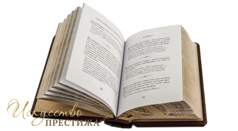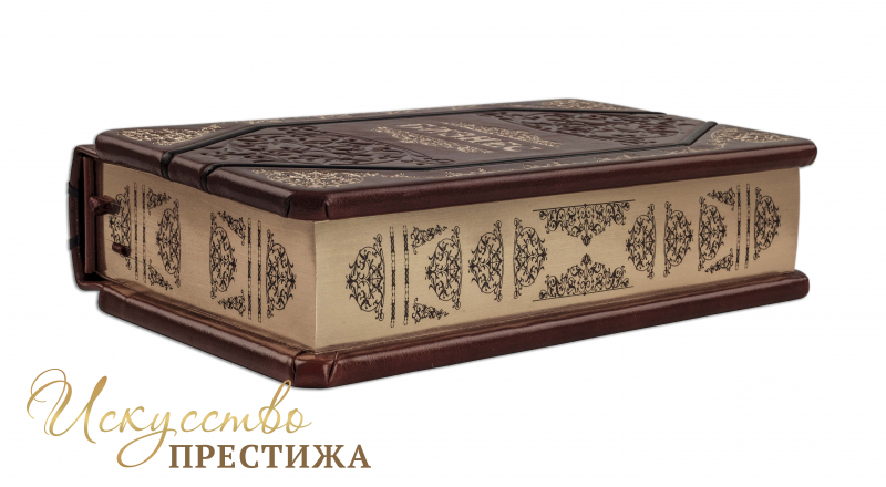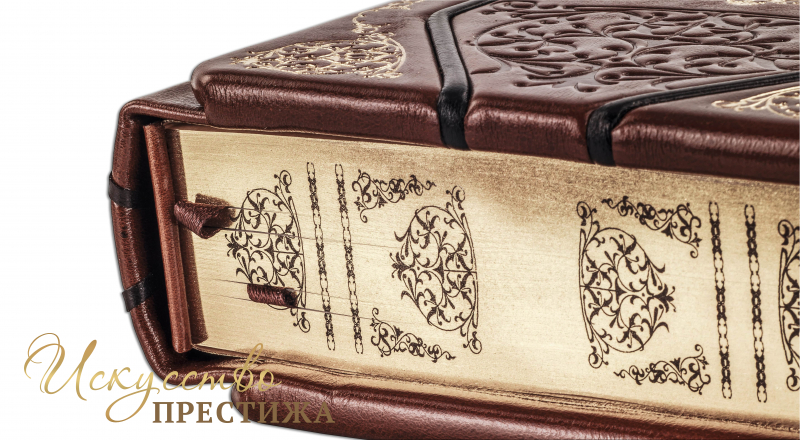 Французский составной переплет ручной работы, выполнен из комбинации натуральной кожи (кожа теленка «Robbat Wisky», кожа «Robbat Cognac» производства итальянской кожевенной фабрики «Carisma»). Обложка книги оформлена многоуровневым тиснением: глубоким блинтовым и рельефным золотым (использована фольга «Luxor 240»). Обрез книги вручную полирован и позолочен сусальным золотом.