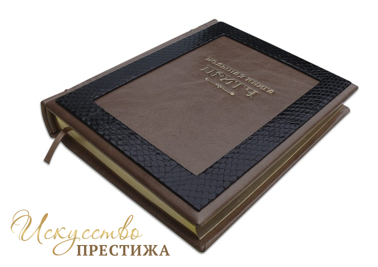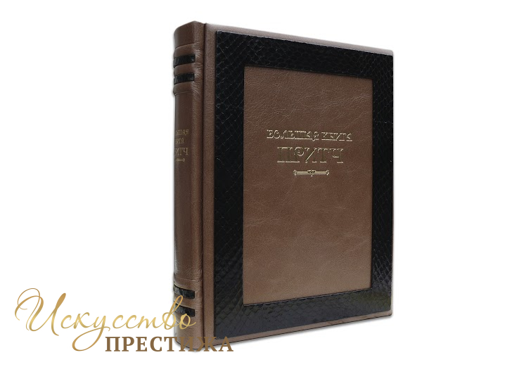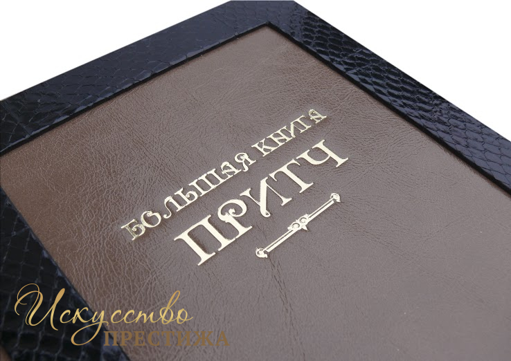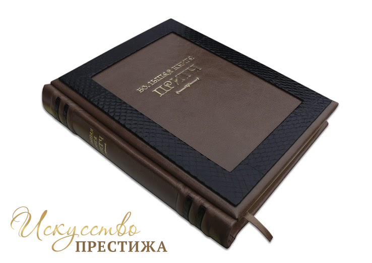 Французский составной переплет ручной работы изготовлен из комбинации натуральной кожи (кожа «Robbat cappuchino», кожа морской змеи производства итальянской кожевенной фабрики «Benericetti»). Обложка книги оформлена рельефным золотым тиснением. Обрез блока вручную полирован и позолочен сусальным золотом.