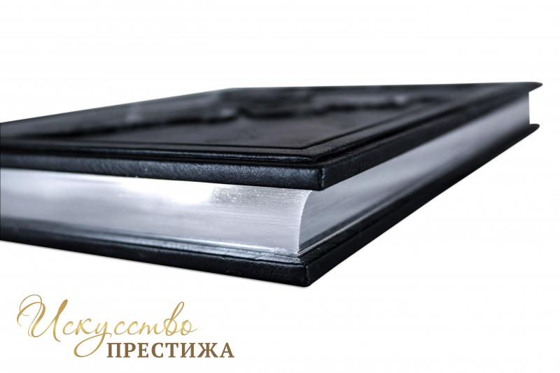 Французский составной переплет ручной работы выполнен из натуральной кожи «Marrone» производства итальянской кожевенной фабрики «Motta Alfredo». Обложка книги двухуровневая, оформлена объемными узорами ручной продавки, рельефным серебряным тиснением. Обрез вручную полирован и посеребрен сусальным серебром.