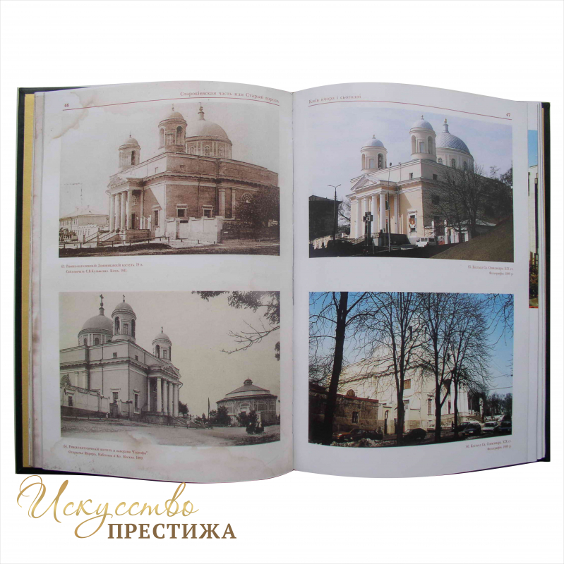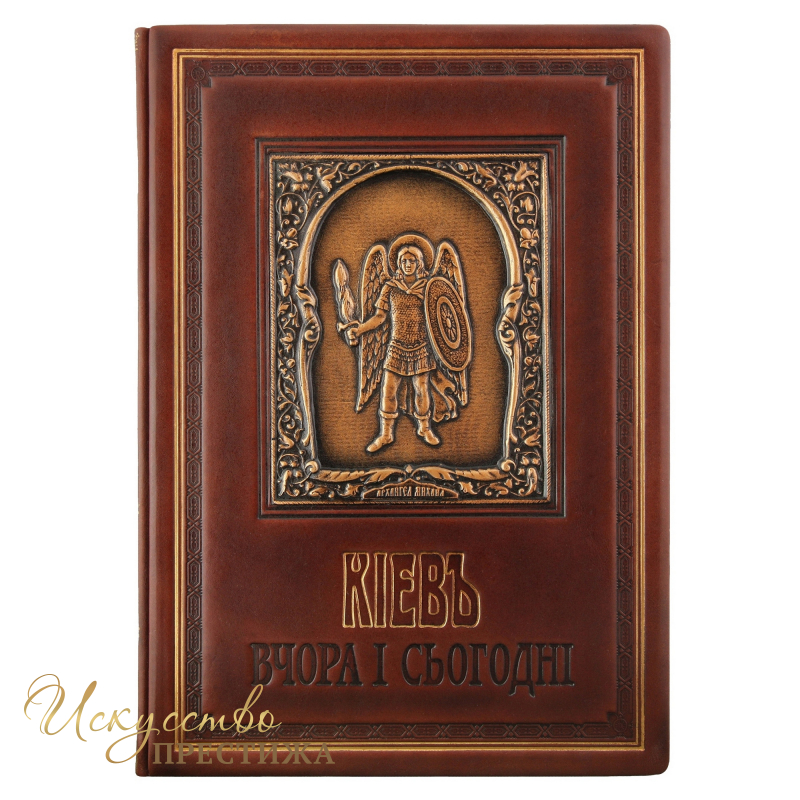 У вас есть возможность купить книгу-альбом «Киев вчера и сегодня» в единственном в своём роде кожаном переплёте. Он выполнен из итальянской кожи, на него нанесено тиснением образ Архангела Михаила – православного защитника Киева. Этот барельеф выполнен конгревным методом, что позволило добиться перенесения на кожу самых мелких деталей образа. Некоторые элементы кожи отделаны позолоченной фольгой, что придаёт альбому драгоценный вид.