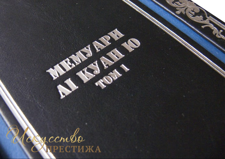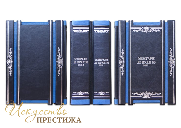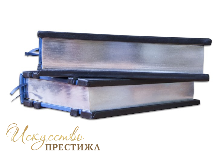 Французькі складові палітурки ручної роботи виконані з комбінації натуральної шкіри (шкіра «Nero Zegna», шкіра «Robbat Blue» виробництва італійської фабрики «Carisma»). Обкладинки книг унікальної дворівневої архітектури оздоблені рельєфним срібним тисненням, з використанням фольги «Luxor 240». Обрізи вручну поліровані і посрібнені сусальним сріблом.