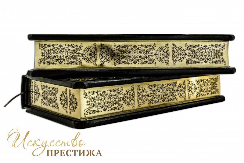 Французский составной переплет ручной работы выполнен из натуральной кожи «Scarlett Brown» производства итальянской кожевенной фабрики «Benericetti». Обложка книги оформлена объемными узорами ручного тиснения, рельефным золотым тиснением, с использованием фольги «Luxor 240». Обрез книг позолочен и декорирован гравированным узором. Подставка выполнена в том же стиле, что и книги.