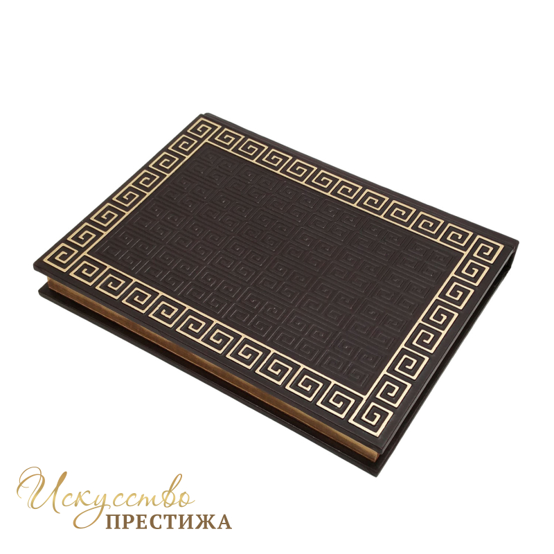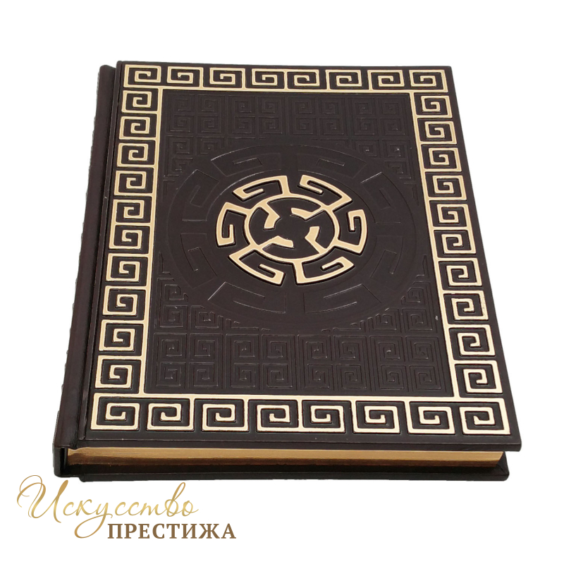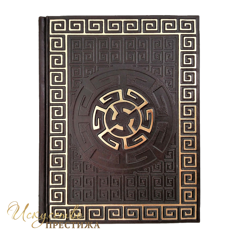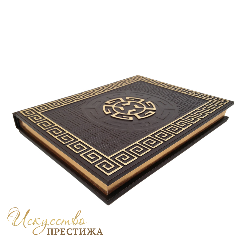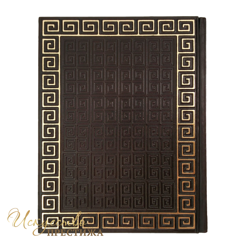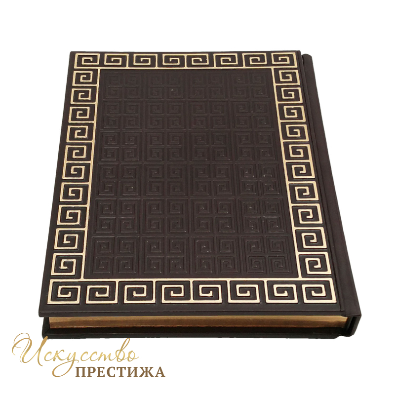 Переплет французский цельно-кожаный, ручной работы. Обрез полированный цвет золото. Цвет кожи коричневый( Италия). Бумага полноцветная мелованая с иллюстрациями.