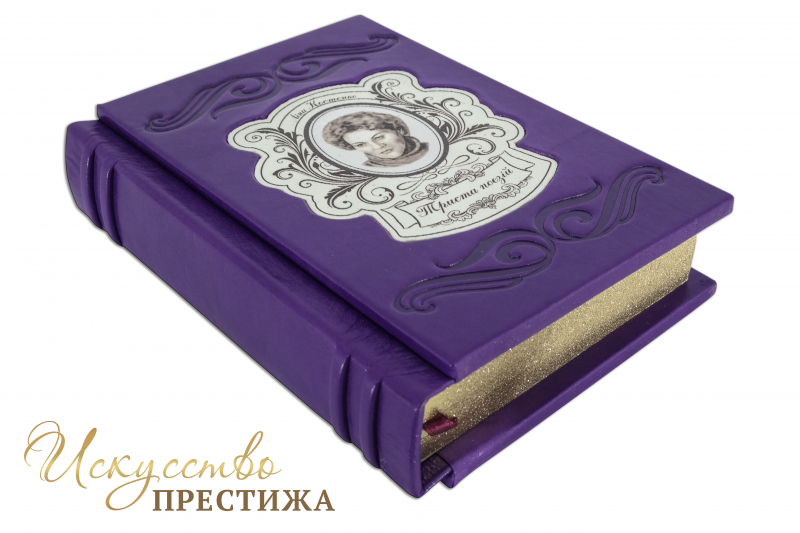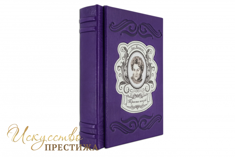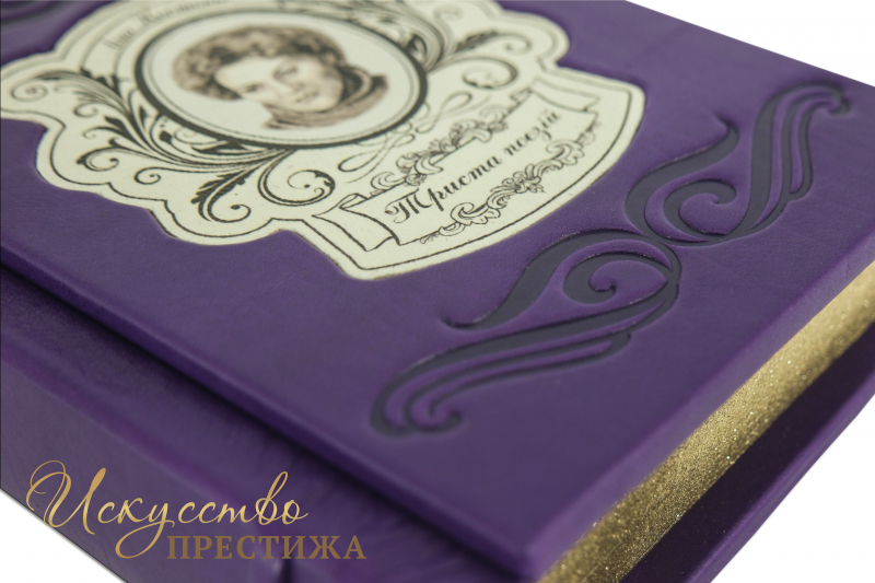 Французька складова палітурка ручної роботи виконана з натуральної шкіри теляти “Porpora” виробництва італійської шкіряної фабрики “Claudio”. Обкладинка книги оформлена глибоким блінтовим тисненням і декорована вставкою з полотна з художнім принтом. Обріз книги вручну шлифований і позолочений сусальним золотом.