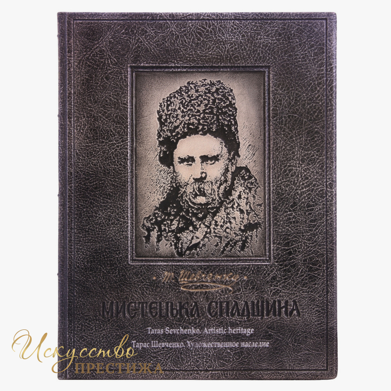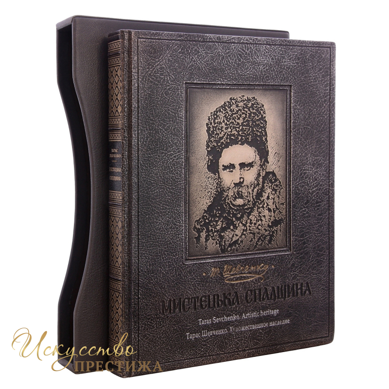 Купить книгу «Тарас Шевченко. Художественное наследие» можно в фирменном кожаном переплёте. Он выполнен вручную из итальянской кожи. Оригинальный барельеф портрета Тараса Шевченко на лицевой части выполнен конгревным тиснением с позолоченной фольгой. Кожа тонированная.