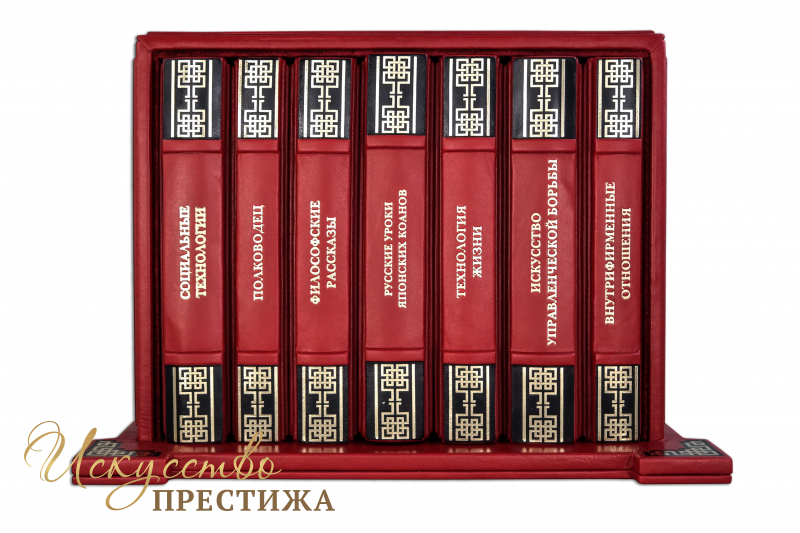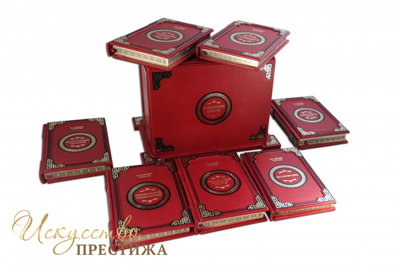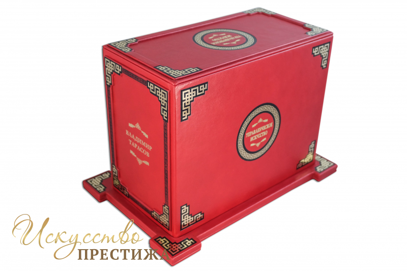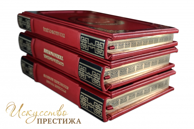 Французский составной переплет ручной работы выполнен из натуральной кожи теленка «Scarlett Rosso» производства итальянской кожевенной фабрики «Carisma». Обложки книг двухуровневые, оформлены объемными узорами ручного тиснения, декорированы рельефным тиснением, c использованием золотой и черной фольги «Luxor 240». Обрезы выполнены в уникальной технологии художественной запечатки золотой основы. Футляр выполнен в том же стиле, что и книги.