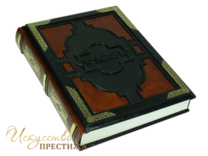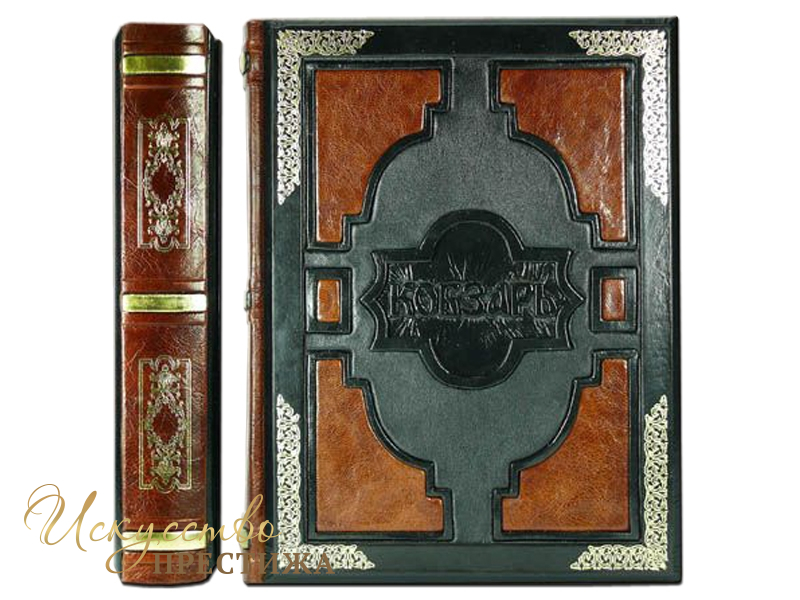 Переплёт ручной работы, выполненный из комбинации натуральных кож (кожа чёрная, овчина, сорта «Moto Alfredo» Италия; кожа чёрная телячья, сорта Larissa Chesnut, Италия; кожа козья «коньяк», Италия).