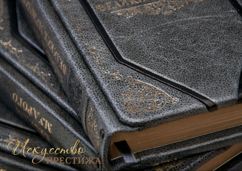 Французский составной переплет ручной работы, выполнен из комбинации натуральной кожи (Кожа «Traboccare»; Кожа «Grash» производства итальянской кожевенной фабрики «Claudio»). Обложка книги и футляр - ложемент, оформлены многоуровневым тиснением, глубоким блинтовым и рельефным золотым, с использованием фольги «Luxor 240». Внутреннее убранство футляра устлано натуральным бархатом «Morbidezza». Обрез книги вручную полирован и позолочен сусальным золотом. В комплекте два бархатных чехла. Тираж – 8 переплетных экземпляров. Сертификат.