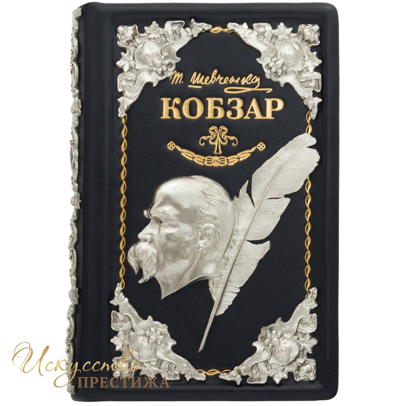 Подарочная книга выполнена в роскошном цельнокожаном переплёте ручной работы и медными накладками с позолотой, серебрением, сканью, эмалями. Книга «Кобзарь» Тараса Григорьевича Шевченка 1867 года издания. Издание было напечатано в типографии Императорской Академии наук за средства Д. Е. Кожанчикова в городе Санкт-петербурге с портретом Т. Г. Шевченка.