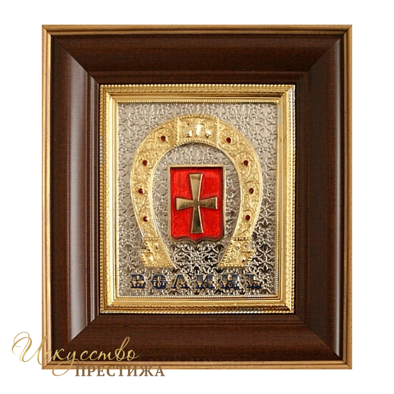 Основу подарочной композиции составляют: подкова - символ счастья и благополучия; и герб города Волыни. Прекрасный памятный подарок гостям города.