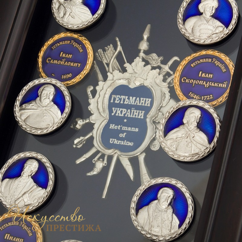 В подарке 'Гетманы Украины' портреты гетманов Украины, выполнены скульпторами С. Силенко и А. Зигурой по самым достоверным иконографическим материалам. Гравёрно-моделирующие работы композиции - В. Жернова. Художественный картуш работы - С. Силенко.