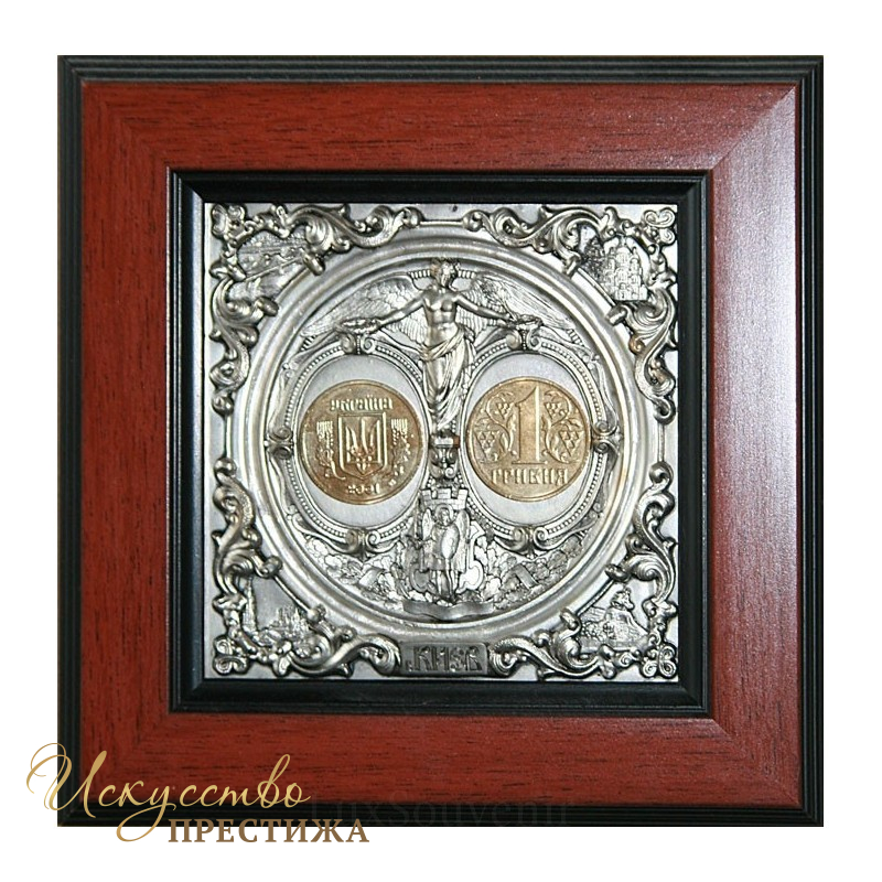 В основе сувенира лежит композиция медалей 19 века. В углах находятся достопримечательности Киева: Владимирский собор, Николаевский цепной мост (ныне не существует), Киево-Печерская Лавра, памятник Б. Хмельницкому. В нижней части сувенира находится герб Киева. Под ангелом находятся лицевая и оборотная стороны монеты номиналом «1 гривна».