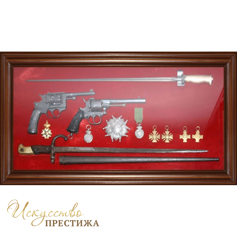 В композиции подарка оформлены оригинальные штыки девятнадцатого века и копии револьверов Лефоше и Лебеля, а также награды начиная с 1855 года и по окончание II-й мировой войны.