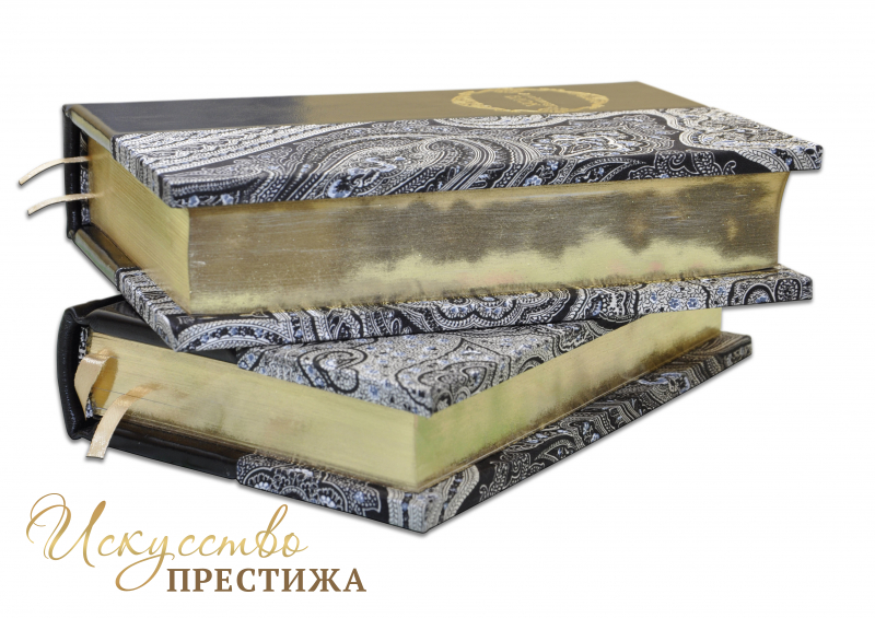 Французский цельноКожаный переплет ручной работы выполнен из комбинации натуральной кожи «Robbat nero» производства итальянской кожевенной фабрики «Carisma» и ткани жаккард. Обложки книг оформлены рельефным золотым и серебряным тиснением, с использованием фольги «Luxor 240». Обрез блоков вручную полирован и позолочен сусальным золотом. Внутренняя поверхность футляра устлана итальянским коттон-бархатом.
