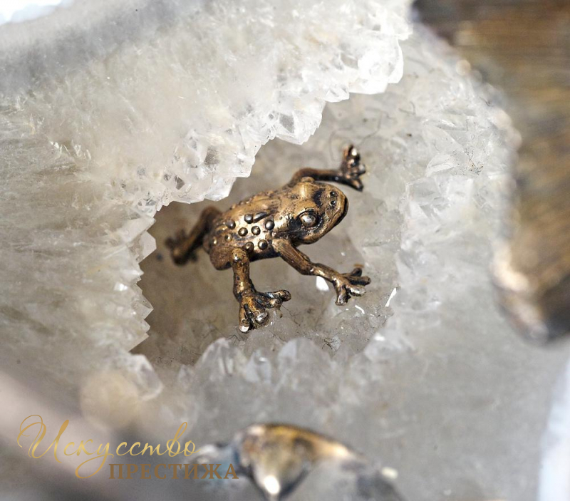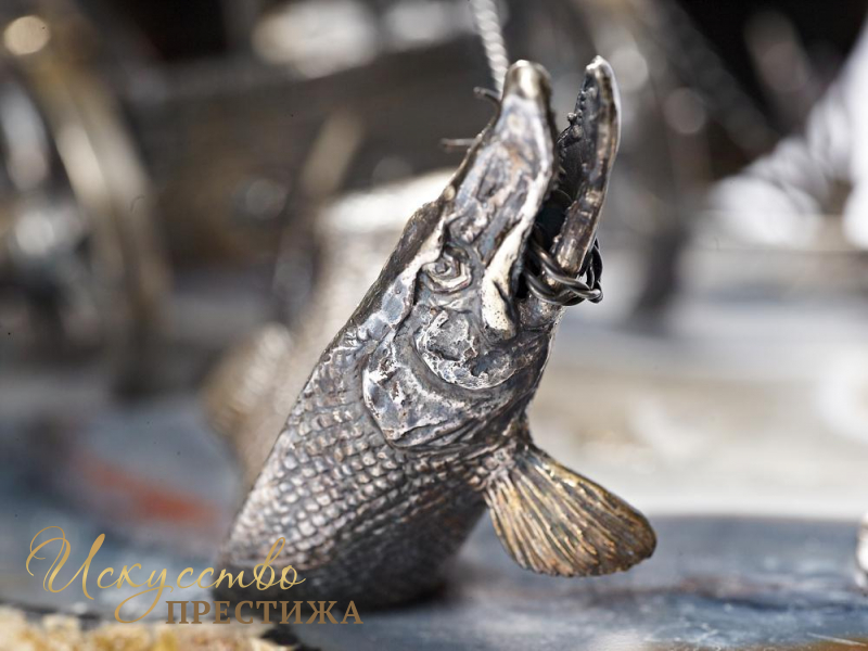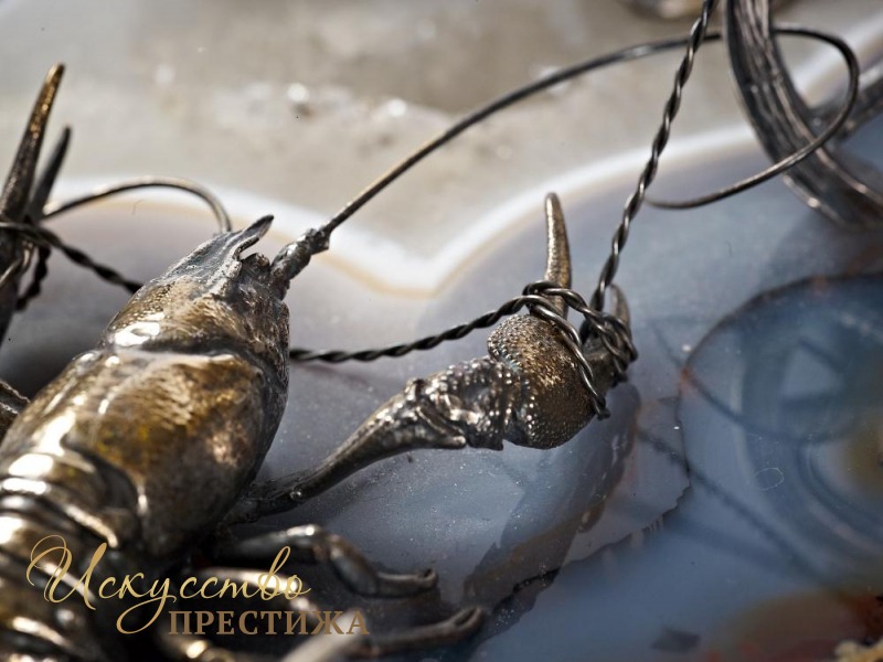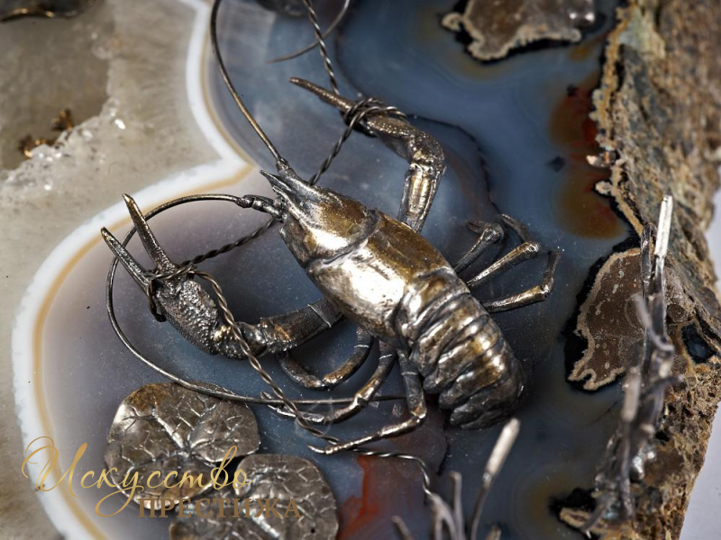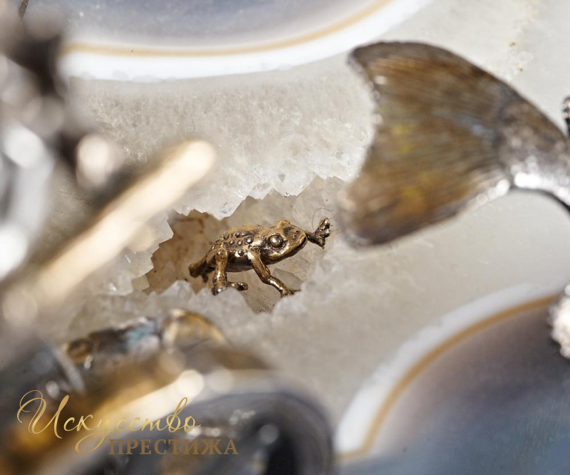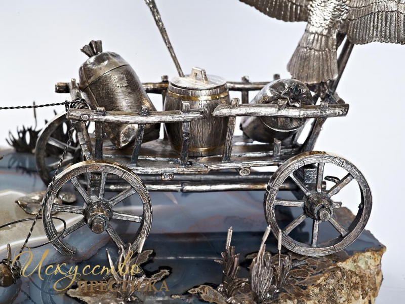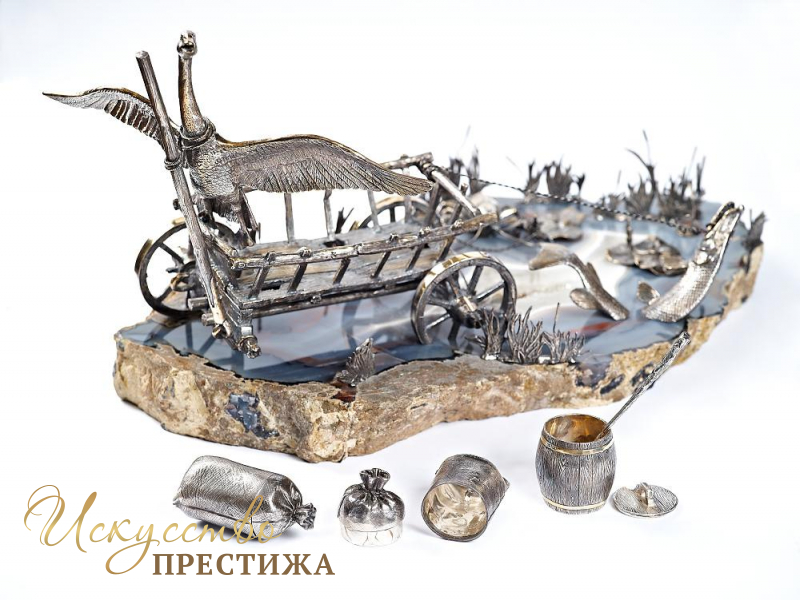 Великолепный эксклюзивный серебряный набор для специй с позолотой "Лебедь, щука и рак", на подставке из натурального камня.