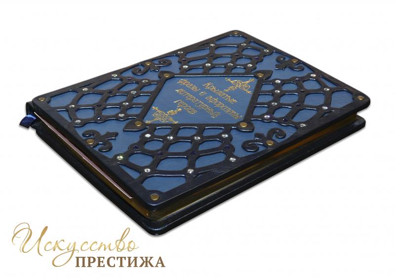 Французский составной переплет ручной работы изготовлен из комбинации натуральных кож (Кожа «Blu Metallizzato», Кожа теленка «Turchese» производства итальянской кожевенной фабрики «Carisma»).Обложка книги оформлена объемными узорами ручного затягивания в кожу, с инкрустацией камнями циркон брильянтовой огранки высшего сорта (производство компании «Signity»), диаметром 5 мм (количество 48 шт.), латунными холитенами «Антик», количеством 12 шт. Обрез блока вручную полирован и позолочен сусальным золотом.