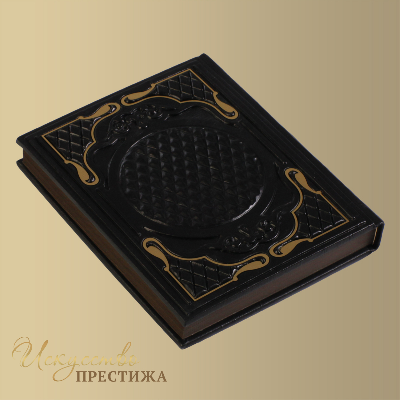 О переплете: переплет французскийцельноКожаный ручной работы. Кожа черного цвета (Италия). В центре - художественная композиция с Кожаной вставкой, обрамление – гравировка .Цвет - "золото" и " серебро". Каптал шелковый, ручного плетения. Форзац составной. Обрез полированный, цвет - "коричневый".