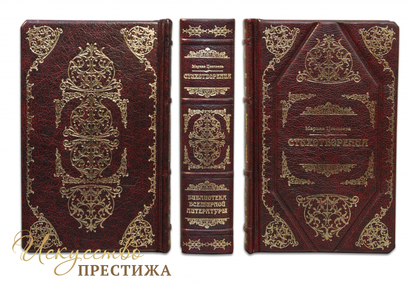 Французский цельноКожаный переплет ручной работы выполнен из натуральной кожи «Marma rossa» производства итальянской кожевенной фабрики «Carisma». Обложка книги декорирована комбинацией рельефного блинтового и золотого тиснения (использована фольга «Luxor 240»). Обрез книги вручную полирован и позолочен сусальным золотом.