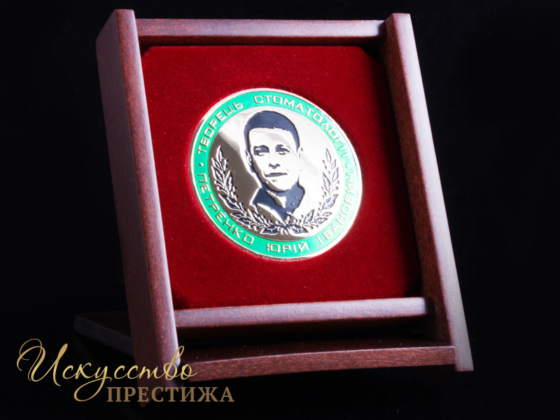 Данная медаль была изготовлена из латуни, с последующим покрытием золотом 999 пробы. Медаль имеет размер 60 мм в диаметре и 3 мм толщиной. В стоимость входит футляр из натурального дерева ручной работы.