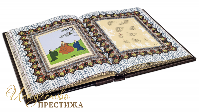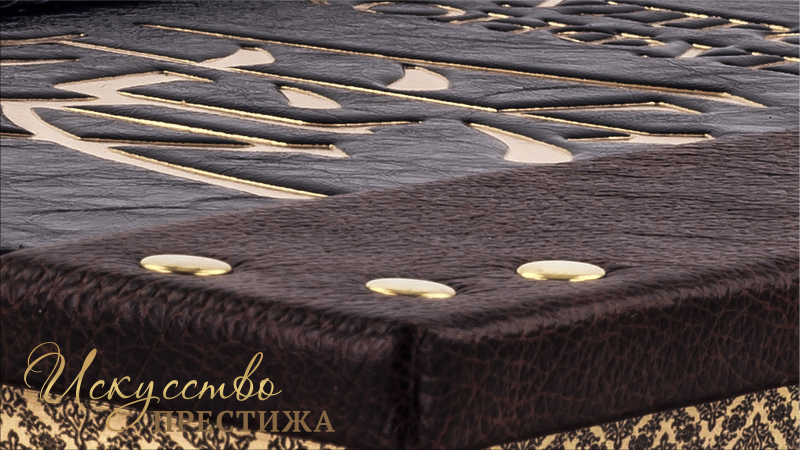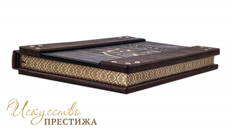 Французский переплет ручной работы выполненный из комбинации натуральных кож (Кожа «Marma Brown»; Кожа черная лаковая «Avrora Vernice» производство итальянской кожевенной фабрики Claudio,). Обложка книги двухуровневая , в классическом стиле, оформлена рельефным золотым тиснением, латунными холитенами количеством 6 шт., плетеной Кожаной тесьмой. Обрез книги полирован и окрашен вручную, цвет «Bronze». Тираж 30 номерных экземпляров. Сертификат. В комплекте чехол.