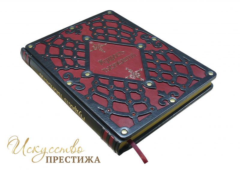 (Кожа телячья «Nero», Кожа телячья «Rossa», производства ведущих итальянских фабрик). Обложка книг оформлена объемными узорами ручного затягивания в кожу, с инкрустацией камнями циркон (цвет гранат) брильянтовой огранки высшего сорта (производство компании Signity), диаметром 5 мм. (количество 48 шт.). Латунными холитенами ‘Антик’ количеством 18 шт. Тираж 15 номерных экземпляров. Сертификат. В комплекте бархатный чехол на молнии.